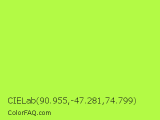 CIELab 90.955,-47.281,74.799 Color is a light green color and the nearest color is Green Lizard #a7f432. Hex code #b3fa45 and RGB value is rgb(179,250,69). In RGB color space, this color is composed of 70% red, 98% green, 27% blue, In CMYK color space, this color is composed of 28% cyan, 0% magenta, 72% yellow , 2% black , In HSL color space, this color has a hue angle of 84° , 95% saturation and 63% lightness.