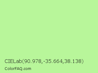 CIELab 90.978,-35.664,38.138 Color is a light green color and the nearest color is Reef #c9ffa2. Hex code #b8f69a and RGB value is rgb(184,246,154). In RGB color space, this color is composed of 72% red, 96% green, 60% blue, In CMYK color space, this color is composed of 25% cyan, 0% magenta, 37% yellow , 4% black , In HSL color space, this color has a hue angle of 100° , 84% saturation and 78% lightness.
