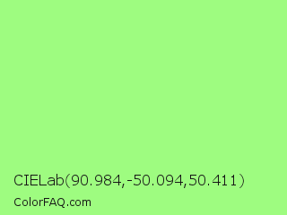 CIELab 90.984,-50.094,50.411 Color is a light green color and the nearest color is Pale Green #98fb98. Hex code #9efc80 and RGB value is rgb(158,252,128). In RGB color space, this color is composed of 62% red, 99% green, 50% blue, In CMYK color space, this color is composed of 37% cyan, 0% magenta, 49% yellow , 1% black , In HSL color space, this color has a hue angle of 105° , 95% saturation and 75% lightness.