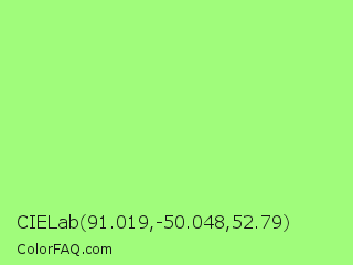 CIELab 91.019,-50.048,52.79 Color is a light green color and the nearest color is Light Green #90ee90. Hex code #a0fc7b and RGB value is rgb(160,252,123). In RGB color space, this color is composed of 63% red, 99% green, 48% blue, In CMYK color space, this color is composed of 37% cyan, 0% magenta, 51% yellow , 1% black , In HSL color space, this color has a hue angle of 103° , 96% saturation and 74% lightness.