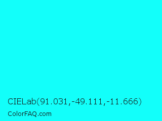 CIELab 91.031,-49.111,-11.666 Color is a normal cyan color and the nearest color is Loeen #15f2fd. Hex code #12fffa and RGB value is rgb(18,255,250). In RGB color space, this color is composed of 7% red, 100% green, 98% blue, In CMYK color space, this color is composed of 93% cyan, 0% magenta, 2% yellow , 0% black , In HSL color space, this color has a hue angle of 179° , 100% saturation and 54% lightness.