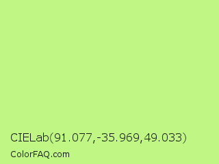 CIELab 91.077,-35.969,49.033 Color is a light green color and the nearest color is Sulu #c1f07c. Hex code #bff684 and RGB value is rgb(191,246,132). In RGB color space, this color is composed of 75% red, 96% green, 52% blue, In CMYK color space, this color is composed of 22% cyan, 0% magenta, 46% yellow , 4% black , In HSL color space, this color has a hue angle of 89° , 86% saturation and 74% lightness.