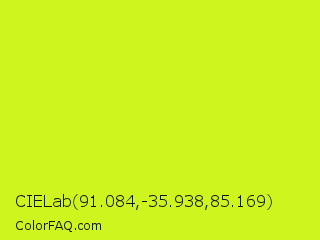 CIELab 91.084,-35.938,85.169 Color is a normal lime color and the nearest color is Arctic Lime #d0ff14. Hex code #cff51f and RGB value is rgb(207,245,31). In RGB color space, this color is composed of 81% red, 96% green, 12% blue, In CMYK color space, this color is composed of 16% cyan, 0% magenta, 87% yellow , 4% black , In HSL color space, this color has a hue angle of 71° , 91% saturation and 54% lightness.