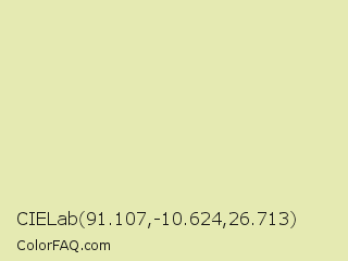 CIELab 91.107,-10.624,26.713 Color is a very light yellow color and the nearest color is Caper #dcedb4. Hex code #e5eab2 and RGB value is rgb(229,234,178). In RGB color space, this color is composed of 90% red, 92% green, 70% blue, In CMYK color space, this color is composed of 2% cyan, 0% magenta, 24% yellow , 8% black , In HSL color space, this color has a hue angle of 65° , 57% saturation and 81% lightness.
