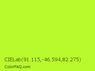 CIELab 91.115,-46.594,82.275 Color is a normal lime color and the nearest color is Green Yellow #adff2f. Hex code #b8fa2b and RGB value is rgb(184,250,43). In RGB color space, this color is composed of 72% red, 98% green, 17% blue, In CMYK color space, this color is composed of 26% cyan, 0% magenta, 83% yellow , 2% black , In HSL color space, this color has a hue angle of 79° , 95% saturation and 57% lightness.