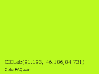 CIELab 91.193,-46.186,84.731 Color is a normal lime color and the nearest color is Green Yellow #adff2f. Hex code #bafa1f and RGB value is rgb(186,250,31). In RGB color space, this color is composed of 73% red, 98% green, 12% blue, In CMYK color space, this color is composed of 26% cyan, 0% magenta, 88% yellow , 2% black , In HSL color space, this color has a hue angle of 78° , 96% saturation and 55% lightness.