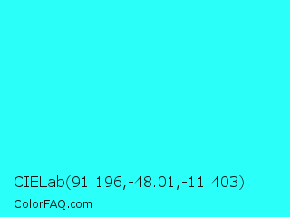 CIELab 91.196,-48.01,-11.403 Color is a normal cyan color and the nearest color is Loeen #15f2fd. Hex code #2afffa and RGB value is rgb(42,255,250). In RGB color space, this color is composed of 16% red, 100% green, 98% blue, In CMYK color space, this color is composed of 84% cyan, 0% magenta, 2% yellow , 0% black , In HSL color space, this color has a hue angle of 179° , 100% saturation and 58% lightness.