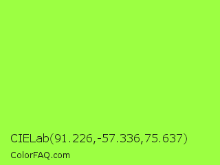 CIELab 91.226,-57.336,75.637 Color is a light green color and the nearest color is French Lime #9efd38. Hex code #9cff42 and RGB value is rgb(156,255,66). In RGB color space, this color is composed of 61% red, 100% green, 26% blue, In CMYK color space, this color is composed of 39% cyan, 0% magenta, 74% yellow , 0% black , In HSL color space, this color has a hue angle of 91° , 100% saturation and 63% lightness.