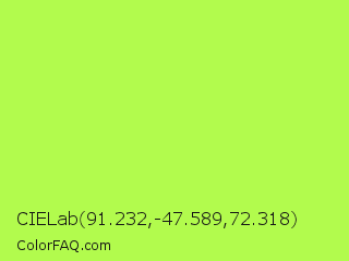CIELab 91.232,-47.589,72.318 Color is a light green color and the nearest color is Inchworm #b2ec5d. Hex code #b2fb4d and RGB value is rgb(178,251,77). In RGB color space, this color is composed of 70% red, 98% green, 30% blue, In CMYK color space, this color is composed of 29% cyan, 0% magenta, 69% yellow , 2% black , In HSL color space, this color has a hue angle of 85° , 96% saturation and 64% lightness.