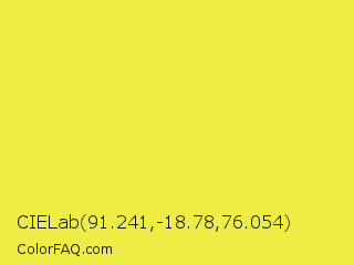 CIELab 91.241,-18.78,76.054 Color is a normal yellow color and the nearest color is Starship #ecf245. Hex code #eded46 and RGB value is rgb(237,237,70). In RGB color space, this color is composed of 93% red, 93% green, 27% blue, In CMYK color space, this color is composed of 0% cyan, 0% magenta, 70% yellow , 7% black , In HSL color space, this color has a hue angle of 60° , 82% saturation and 60% lightness.