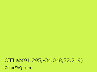 CIELab 91.295,-34.048,72.219 Color is a light lime color and the nearest color is Maximum Green Yellow #d9e650. Hex code #cff54f and RGB value is rgb(207,245,79). In RGB color space, this color is composed of 81% red, 96% green, 31% blue, In CMYK color space, this color is composed of 16% cyan, 0% magenta, 68% yellow , 4% black , In HSL color space, this color has a hue angle of 74° , 89% saturation and 64% lightness.