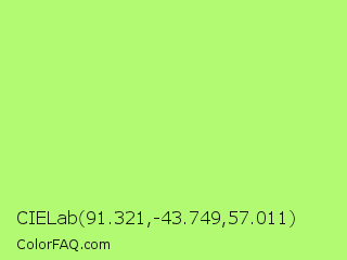 CIELab 91.321,-43.749,57.011 Color is a light green color and the nearest color is Sulu #c1f07c. Hex code #b3fa73 and RGB value is rgb(179,250,115). In RGB color space, this color is composed of 70% red, 98% green, 45% blue, In CMYK color space, this color is composed of 28% cyan, 0% magenta, 54% yellow , 2% black , In HSL color space, this color has a hue angle of 92° , 93% saturation and 72% lightness.