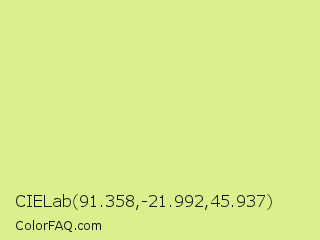 CIELab 91.358,-21.992,45.937 Color is a light lime color and the nearest color is Mindaro #e3f988. Hex code #dbf08c and RGB value is rgb(219,240,140). In RGB color space, this color is composed of 86% red, 94% green, 55% blue, In CMYK color space, this color is composed of 9% cyan, 0% magenta, 42% yellow , 6% black , In HSL color space, this color has a hue angle of 73° , 77% saturation and 75% lightness.