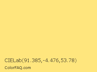 CIELab 91.385,-4.476,53.78 Color is a light yellow color and the nearest color is Yellow Crayola #fce883. Hex code #ffe67d and RGB value is rgb(255,230,125). In RGB color space, this color is composed of 100% red, 90% green, 49% blue, In CMYK color space, this color is composed of 0% cyan, 10% magenta, 51% yellow , 0% black , In HSL color space, this color has a hue angle of 48° , 100% saturation and 75% lightness.
