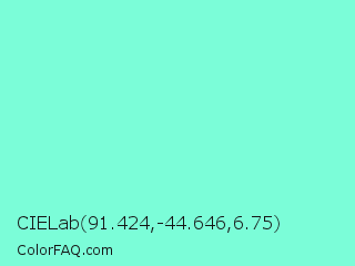 CIELab 91.424,-44.646,6.75 Color is a light green color and the nearest color is Aquamarine #7fffd4. Hex code #7bfdd8 and RGB value is rgb(123,253,216). In RGB color space, this color is composed of 48% red, 99% green, 85% blue, In CMYK color space, this color is composed of 51% cyan, 0% magenta, 15% yellow , 1% black , In HSL color space, this color has a hue angle of 163° , 97% saturation and 74% lightness.