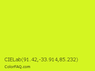 CIELab 91.42,-33.914,85.232 Color is a normal yellow color and the nearest color is Arctic Lime #d0ff14. Hex code #d4f521 and RGB value is rgb(212,245,33). In RGB color space, this color is composed of 83% red, 96% green, 13% blue, In CMYK color space, this color is composed of 13% cyan, 0% magenta, 87% yellow , 4% black , In HSL color space, this color has a hue angle of 69° , 91% saturation and 55% lightness.