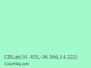 CIELab 91.455,-36.566,14.222 Color is a light green color and the nearest color is Magic Mint #aaf0d1. Hex code #a0f9ca and RGB value is rgb(160,249,202). In RGB color space, this color is composed of 63% red, 98% green, 79% blue, In CMYK color space, this color is composed of 36% cyan, 0% magenta, 19% yellow , 2% black , In HSL color space, this color has a hue angle of 148° , 88% saturation and 80% lightness.