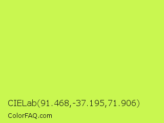 CIELab 91.468,-37.195,71.906 Color is a light lime color and the nearest color is Maximum Green Yellow #d9e650. Hex code #c9f750 and RGB value is rgb(201,247,80). In RGB color space, this color is composed of 79% red, 97% green, 31% blue, In CMYK color space, this color is composed of 19% cyan, 0% magenta, 68% yellow , 3% black , In HSL color space, this color has a hue angle of 77° , 91% saturation and 64% lightness.