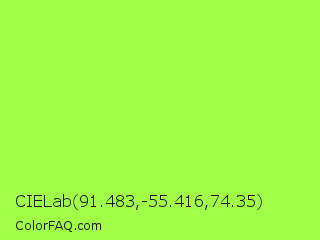 CIELab 91.483,-55.416,74.35 Color is a light green color and the nearest color is French Lime #9efd38. Hex code #a1ff47 and RGB value is rgb(161,255,71). In RGB color space, this color is composed of 63% red, 100% green, 28% blue, In CMYK color space, this color is composed of 37% cyan, 0% magenta, 72% yellow , 0% black , In HSL color space, this color has a hue angle of 91° , 100% saturation and 64% lightness.