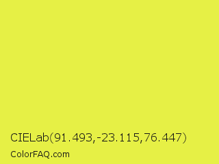 CIELab 91.493,-23.115,76.447 Color is a light yellow color and the nearest color is Starship #ecf245. Hex code #e6f045 and RGB value is rgb(230,240,69). In RGB color space, this color is composed of 90% red, 94% green, 27% blue, In CMYK color space, this color is composed of 4% cyan, 0% magenta, 71% yellow , 6% black , In HSL color space, this color has a hue angle of 64° , 85% saturation and 61% lightness.