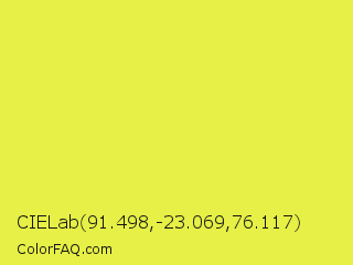 CIELab 91.498,-23.069,76.117 Color is a light yellow color and the nearest color is Starship #ecf245. Hex code #e6f046 and RGB value is rgb(230,240,70). In RGB color space, this color is composed of 90% red, 94% green, 27% blue, In CMYK color space, this color is composed of 4% cyan, 0% magenta, 71% yellow , 6% black , In HSL color space, this color has a hue angle of 64° , 85% saturation and 61% lightness.