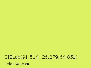CIELab 91.514,-26.279,64.851 Color is a light yellow color and the nearest color is Booger Buster #dde26a. Hex code #dcf263 and RGB value is rgb(220,242,99). In RGB color space, this color is composed of 86% red, 95% green, 39% blue, In CMYK color space, this color is composed of 9% cyan, 0% magenta, 59% yellow , 5% black , In HSL color space, this color has a hue angle of 69° , 85% saturation and 67% lightness.