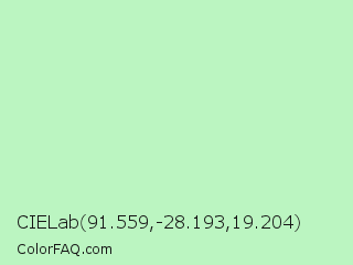 CIELab 91.559,-28.193,19.204 Color is a very light green color and the nearest color is Madang #b7f0be. Hex code #bbf5c1 and RGB value is rgb(187,245,193). In RGB color space, this color is composed of 73% red, 96% green, 76% blue, In CMYK color space, this color is composed of 24% cyan, 0% magenta, 21% yellow , 4% black , In HSL color space, this color has a hue angle of 126° , 74% saturation and 85% lightness.