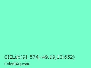 CIELab 91.574,-49.19,13.652 Color is a light green color and the nearest color is Aquamarine #7fffd4. Hex code #77ffcb and RGB value is rgb(119,255,203). In RGB color space, this color is composed of 47% red, 100% green, 80% blue, In CMYK color space, this color is composed of 53% cyan, 0% magenta, 20% yellow , 0% black , In HSL color space, this color has a hue angle of 157° , 100% saturation and 73% lightness.