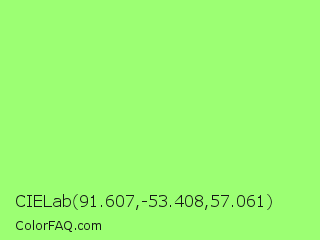 CIELab 91.607,-53.408,57.061 Color is a light green color and the nearest color is Light Green #90ee90. Hex code #9cff73 and RGB value is rgb(156,255,115). In RGB color space, this color is composed of 61% red, 100% green, 45% blue, In CMYK color space, this color is composed of 39% cyan, 0% magenta, 55% yellow , 0% black , In HSL color space, this color has a hue angle of 102° , 100% saturation and 73% lightness.