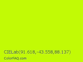CIELab 91.618,-43.558,88.137 Color is a normal lime color and the nearest color is Lime #bfff00. Hex code #c2fa05 and RGB value is rgb(194,250,5). In RGB color space, this color is composed of 76% red, 98% green, 2% blue, In CMYK color space, this color is composed of 22% cyan, 0% magenta, 98% yellow , 2% black , In HSL color space, this color has a hue angle of 74° , 96% saturation and 50% lightness.