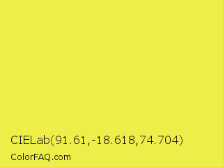 CIELab 91.61,-18.618,74.704 Color is a light yellow color and the nearest color is Starship #ecf245. Hex code #eeee4b and RGB value is rgb(238,238,75). In RGB color space, this color is composed of 93% red, 93% green, 29% blue, In CMYK color space, this color is composed of 0% cyan, 0% magenta, 68% yellow , 7% black , In HSL color space, this color has a hue angle of 60° , 83% saturation and 61% lightness.