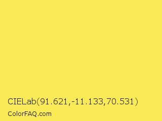 CIELab 91.621,-11.133,70.531 Color is a light yellow color and the nearest color is Candy Corn #fbec5d. Hex code #faea57 and RGB value is rgb(250,234,87). In RGB color space, this color is composed of 98% red, 92% green, 34% blue, In CMYK color space, this color is composed of 0% cyan, 6% magenta, 65% yellow , 2% black , In HSL color space, this color has a hue angle of 54° , 94% saturation and 66% lightness.