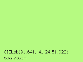 CIELab 91.641,-41.24,51.022 Color is a light green color and the nearest color is Sulu #c1f07c. Hex code #b6fa81 and RGB value is rgb(182,250,129). In RGB color space, this color is composed of 71% red, 98% green, 51% blue, In CMYK color space, this color is composed of 27% cyan, 0% magenta, 48% yellow , 2% black , In HSL color space, this color has a hue angle of 94° , 92% saturation and 74% lightness.