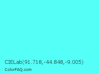 CIELab 91.718,-44.848,-9.005 Color is a light cyan color and the nearest color is Electric Blue #7df9ff. Hex code #53fff7 and RGB value is rgb(83,255,247). In RGB color space, this color is composed of 33% red, 100% green, 97% blue, In CMYK color space, this color is composed of 67% cyan, 0% magenta, 3% yellow , 0% black , In HSL color space, this color has a hue angle of 177° , 100% saturation and 66% lightness.