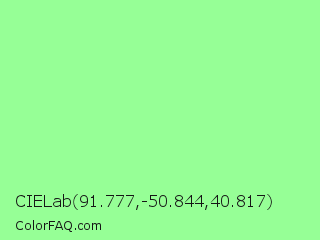 CIELab 91.777,-50.844,40.817 Color is a light green color and the nearest color is Mint Green #98ff98. Hex code #96ff96 and RGB value is rgb(150,255,150). In RGB color space, this color is composed of 59% red, 100% green, 59% blue, In CMYK color space, this color is composed of 41% cyan, 0% magenta, 41% yellow , 0% black , In HSL color space, this color has a hue angle of 120° , 100% saturation and 79% lightness.