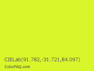 CIELab 91.782,-31.721,84.097 Color is a normal yellow color and the nearest color is Pear #d1e231. Hex code #d9f529 and RGB value is rgb(217,245,41). In RGB color space, this color is composed of 85% red, 96% green, 16% blue, In CMYK color space, this color is composed of 11% cyan, 0% magenta, 83% yellow , 4% black , In HSL color space, this color has a hue angle of 68° , 91% saturation and 56% lightness.