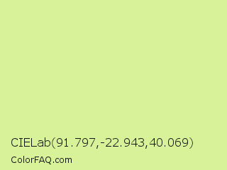 CIELab 91.797,-22.943,40.069 Color is a light lime color and the nearest color is Reef #c9ffa2. Hex code #d7f299 and RGB value is rgb(215,242,153). In RGB color space, this color is composed of 84% red, 95% green, 60% blue, In CMYK color space, this color is composed of 11% cyan, 0% magenta, 37% yellow , 5% black , In HSL color space, this color has a hue angle of 78° , 77% saturation and 77% lightness.