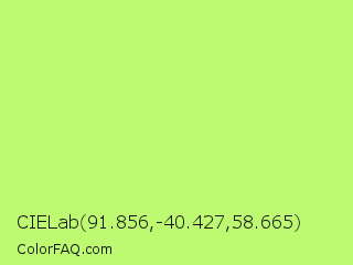 CIELab 91.856,-40.427,58.665 Color is a light green color and the nearest color is Sulu #c1f07c. Hex code #bdfa71 and RGB value is rgb(189,250,113). In RGB color space, this color is composed of 74% red, 98% green, 44% blue, In CMYK color space, this color is composed of 24% cyan, 0% magenta, 55% yellow , 2% black , In HSL color space, this color has a hue angle of 87° , 93% saturation and 71% lightness.