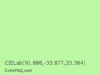 CIELab 91.888,-33.877,33.384 Color is a very light green color and the nearest color is Reef #c9ffa2. Hex code #bbf8a6 and RGB value is rgb(187,248,166). In RGB color space, this color is composed of 73% red, 97% green, 65% blue, In CMYK color space, this color is composed of 25% cyan, 0% magenta, 33% yellow , 3% black , In HSL color space, this color has a hue angle of 105° , 85% saturation and 81% lightness.