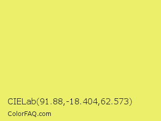 CIELab 91.88,-18.404,62.573 Color is a light yellow color and the nearest color is Manz #eeef78. Hex code #ebef6a and RGB value is rgb(235,239,106). In RGB color space, this color is composed of 92% red, 94% green, 42% blue, In CMYK color space, this color is composed of 2% cyan, 0% magenta, 56% yellow , 6% black , In HSL color space, this color has a hue angle of 62° , 81% saturation and 68% lightness.