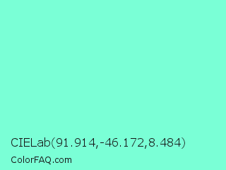 CIELab 91.914,-46.172,8.484 Color is a light green color and the nearest color is Aquamarine #7fffd4. Hex code #7affd6 and RGB value is rgb(122,255,214). In RGB color space, this color is composed of 48% red, 100% green, 84% blue, In CMYK color space, this color is composed of 52% cyan, 0% magenta, 16% yellow , 0% black , In HSL color space, this color has a hue angle of 162° , 100% saturation and 74% lightness.