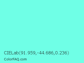 CIELab 91.959,-44.686,0.236 Color is a light cyan color and the nearest color is Aquamarine #7fffd4. Hex code #6fffe6 and RGB value is rgb(111,255,230). In RGB color space, this color is composed of 44% red, 100% green, 90% blue, In CMYK color space, this color is composed of 56% cyan, 0% magenta, 10% yellow , 0% black , In HSL color space, this color has a hue angle of 170° , 100% saturation and 72% lightness.