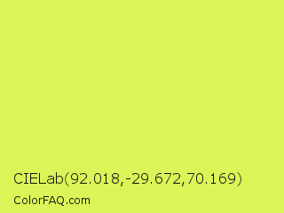 CIELab 92.018,-29.672,70.169 Color is a light lime color and the nearest color is Maximum Green Yellow #d9e650. Hex code #d9f557 and RGB value is rgb(217,245,87). In RGB color space, this color is composed of 85% red, 96% green, 34% blue, In CMYK color space, this color is composed of 11% cyan, 0% magenta, 64% yellow , 4% black , In HSL color space, this color has a hue angle of 71° , 89% saturation and 65% lightness.