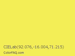 CIELab 92.076,-16.004,71.215 Color is a light yellow color and the nearest color is Candy Corn #fbec5d. Hex code #f3ee56 and RGB value is rgb(243,238,86). In RGB color space, this color is composed of 95% red, 93% green, 34% blue, In CMYK color space, this color is composed of 0% cyan, 2% magenta, 65% yellow , 5% black , In HSL color space, this color has a hue angle of 58° , 87% saturation and 65% lightness.
