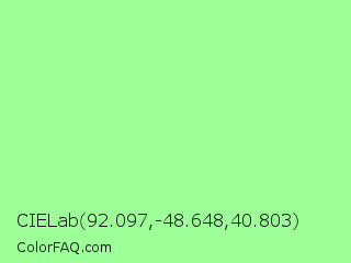 CIELab 92.097,-48.648,40.803 Color is a light green color and the nearest color is Mint Green #98ff98. Hex code #9dff97 and RGB value is rgb(157,255,151). In RGB color space, this color is composed of 62% red, 100% green, 59% blue, In CMYK color space, this color is composed of 38% cyan, 0% magenta, 41% yellow , 0% black , In HSL color space, this color has a hue angle of 117° , 100% saturation and 80% lightness.