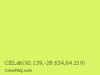 CIELab 92.139,-28.634,64.219 Color is a light lime color and the nearest color is Booger Buster #dde26a. Hex code #d9f566 and RGB value is rgb(217,245,102). In RGB color space, this color is composed of 85% red, 96% green, 40% blue, In CMYK color space, this color is composed of 11% cyan, 0% magenta, 58% yellow , 4% black , In HSL color space, this color has a hue angle of 72° , 88% saturation and 68% lightness.