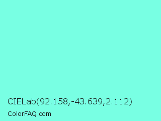 CIELab 92.158,-43.639,2.112 Color is a light cyan color and the nearest color is Aquamarine #7fffd4. Hex code #78ffe3 and RGB value is rgb(120,255,227). In RGB color space, this color is composed of 47% red, 100% green, 89% blue, In CMYK color space, this color is composed of 53% cyan, 0% magenta, 11% yellow , 0% black , In HSL color space, this color has a hue angle of 168° , 100% saturation and 74% lightness.