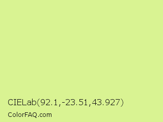 CIELab 92.1,-23.51,43.927 Color is a light lime color and the nearest color is Mindaro #e3f988. Hex code #d9f392 and RGB value is rgb(217,243,146). In RGB color space, this color is composed of 85% red, 95% green, 57% blue, In CMYK color space, this color is composed of 11% cyan, 0% magenta, 40% yellow , 5% black , In HSL color space, this color has a hue angle of 76° , 80% saturation and 76% lightness.