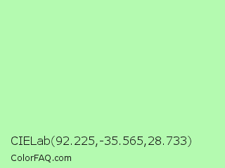 CIELab 92.225,-35.565,28.733 Color is a very light green color and the nearest color is Madang #b7f0be. Hex code #b4fab0 and RGB value is rgb(180,250,176). In RGB color space, this color is composed of 71% red, 98% green, 69% blue, In CMYK color space, this color is composed of 28% cyan, 0% magenta, 30% yellow , 2% black , In HSL color space, this color has a hue angle of 117° , 88% saturation and 84% lightness.