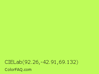 CIELab 92.26,-42.91,69.132 Color is a light green color and the nearest color is Inchworm #b2ec5d. Hex code #befc59 and RGB value is rgb(190,252,89). In RGB color space, this color is composed of 75% red, 99% green, 35% blue, In CMYK color space, this color is composed of 25% cyan, 0% magenta, 65% yellow , 1% black , In HSL color space, this color has a hue angle of 83° , 96% saturation and 67% lightness.